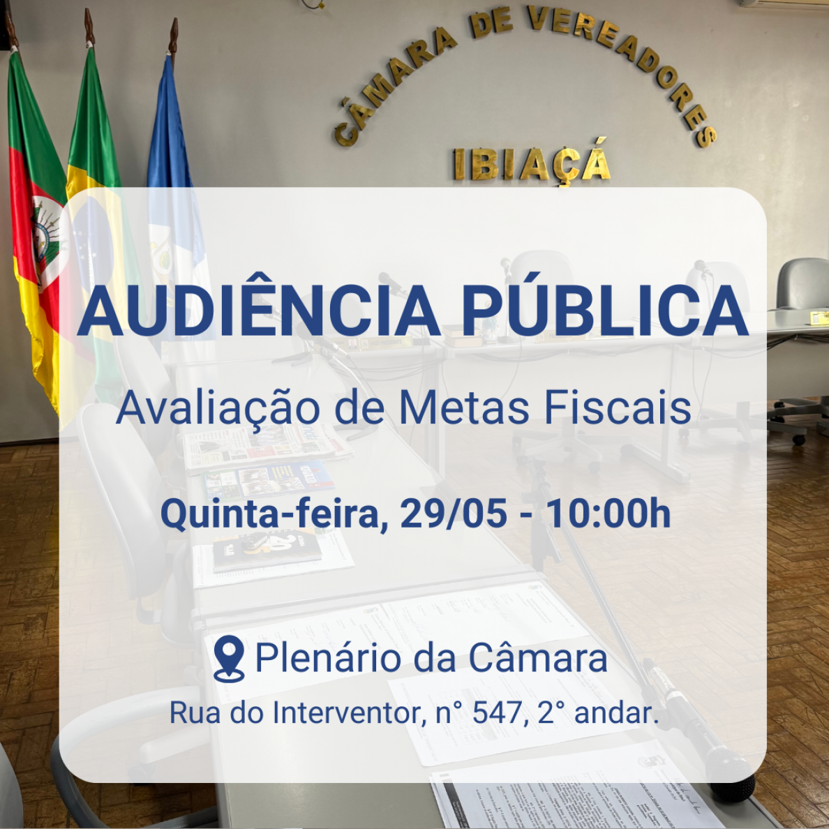 Uma audiência pública, marcada para a manhã desta quinta-feira (29), vai avaliar o cumprimento das metas fiscais pelo Governo de Ibiaçá relativas ao primeiro quadrimestre de 2025. A reunião foi convocada pelo Presidente da Câmara de Vereadores, Keilor Basso, e acontece no Plenário da Casa, às 10h.