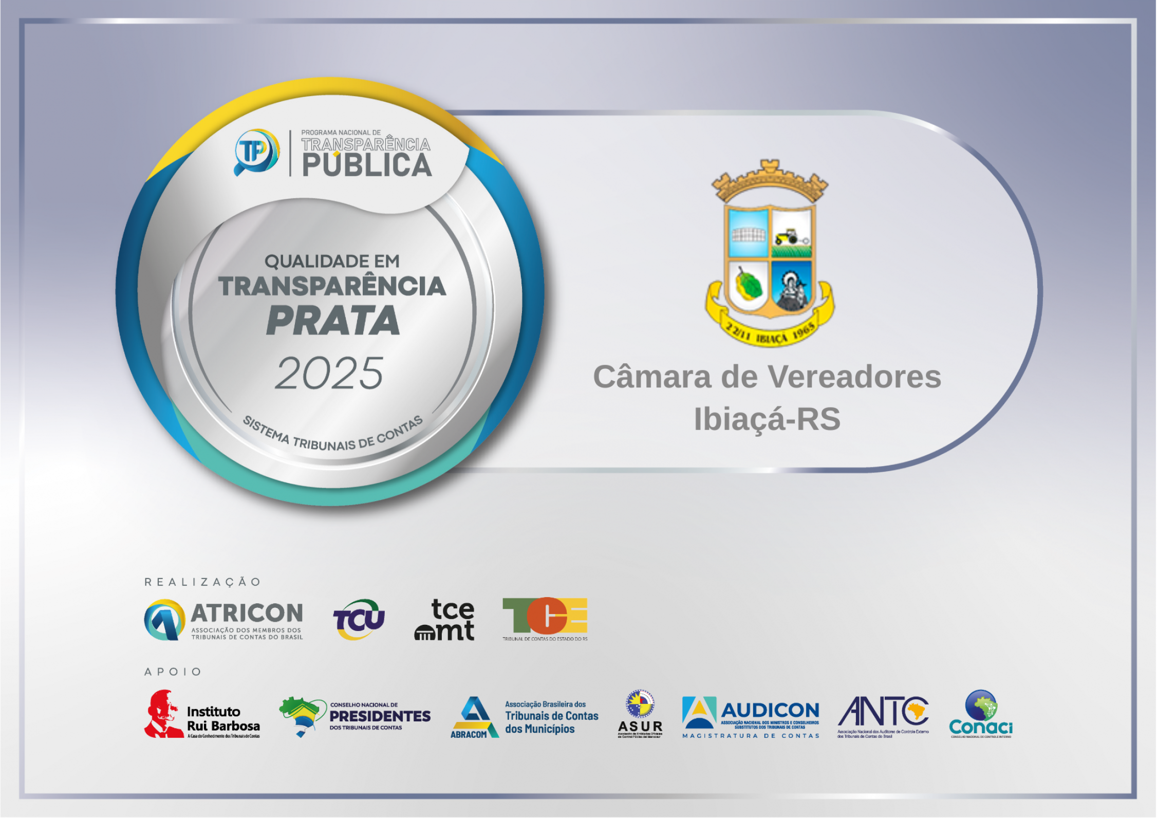 A Associação dos Membros dos Tribunais de Contas do Brasil (ATRICON) confirmou, nesta segunda-feira (19), o nível prata no índice de transparência aferido à Câmara de Vereadores de Ibiaçá. A certificação, emitida pelo Tribunal de Contas do Estado do Rio Grande do Sul (TCE-RS), ratifica a avaliação realizada em junho do ano passado pelo setor de Controle Interno, que já indicava o avanço do nível “Básico” para o nível “Prata”.