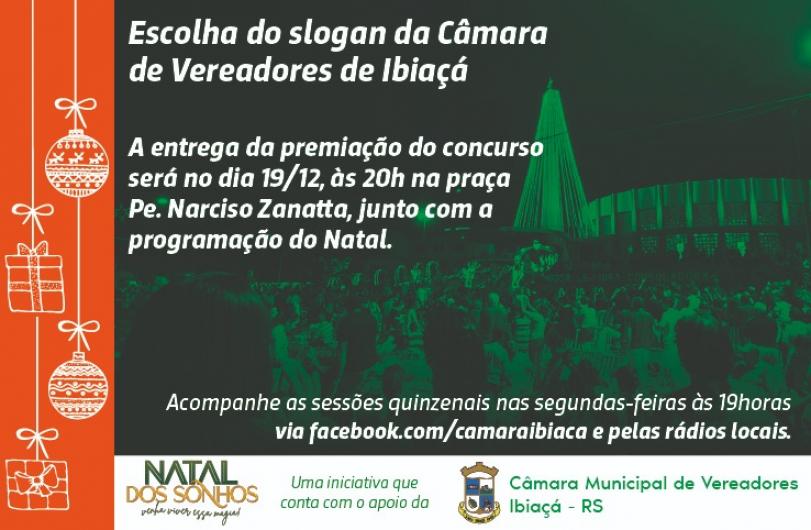 Participe da entrega da premiação do Concurso da Escolha do Slogan da Câmara de Vereadores de Ibiaçá! A divulgação do resultado acontece junto à programação do Natal dos Sonhos.